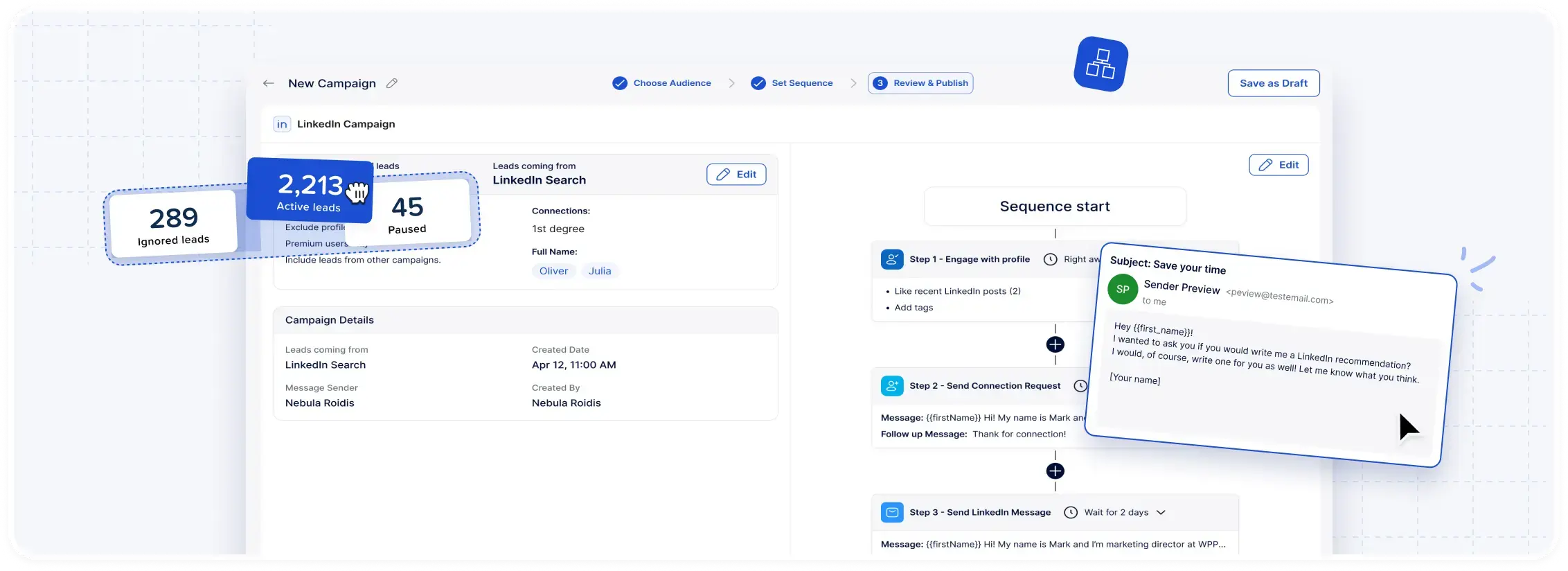 Launch multi-step campaigns that feel one-on-one. Use dynamic fields, smart delays, and pre-built templates to create personalized sequences at scale.