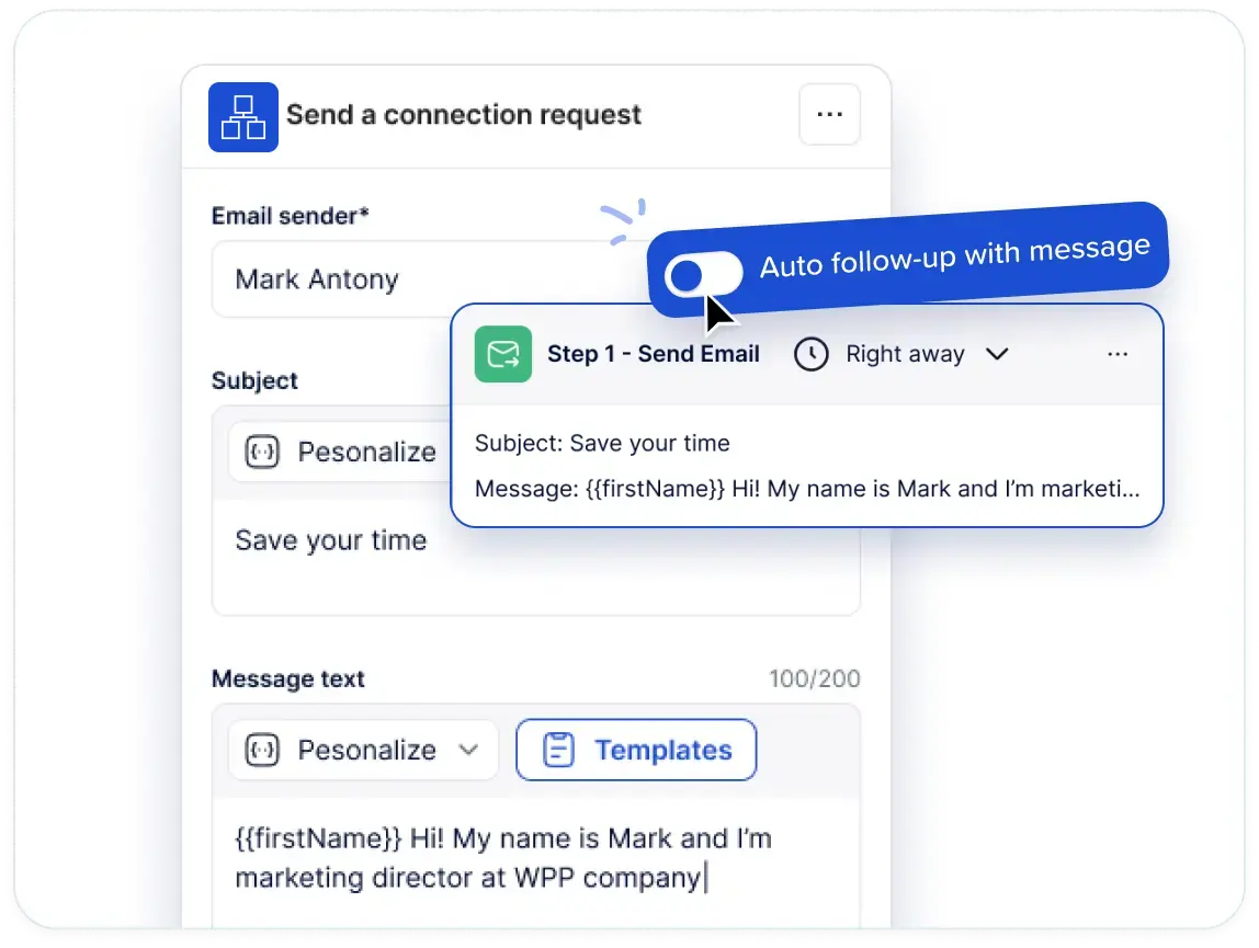 Put your LinkedIn lead generation on autopilot – without losing that personal touch. Automatically send tailored connection requests, follow-ups, and direct messages to keep the conversation going.